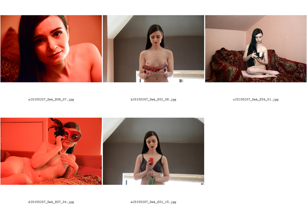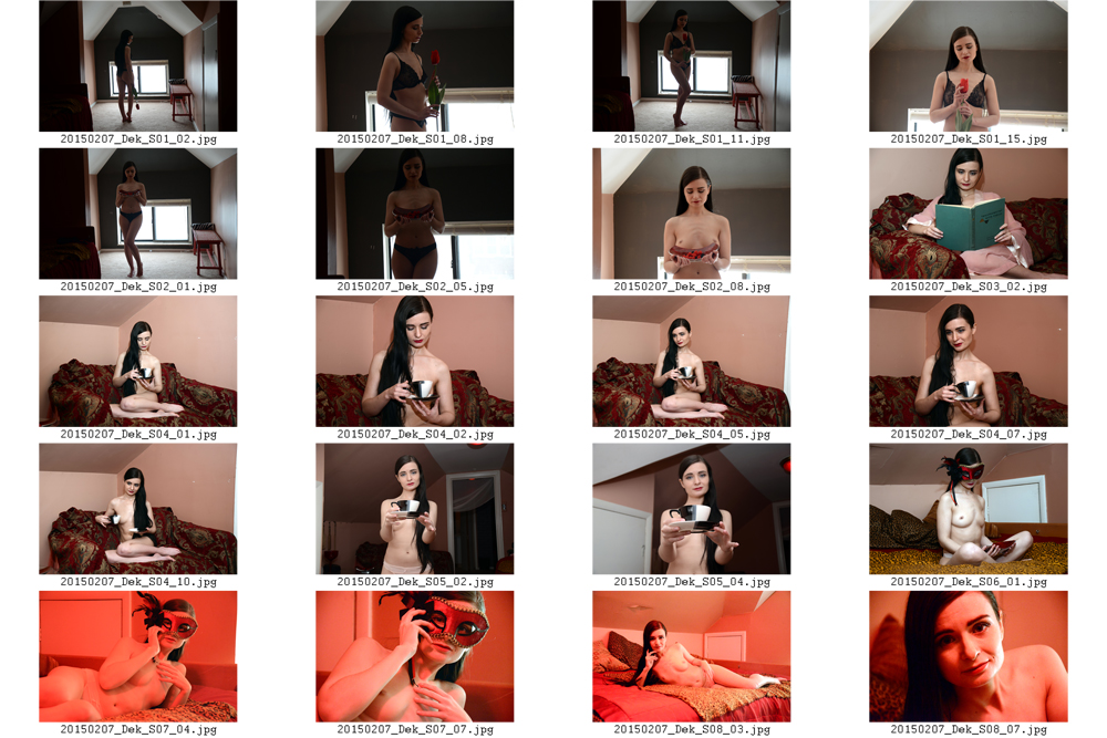At the Chaos Talent valentine shoot I shot with Dekilah for 37 minutes and ended up with 68 usable images split over 8 sets. My first cut brings it down to 30 images.